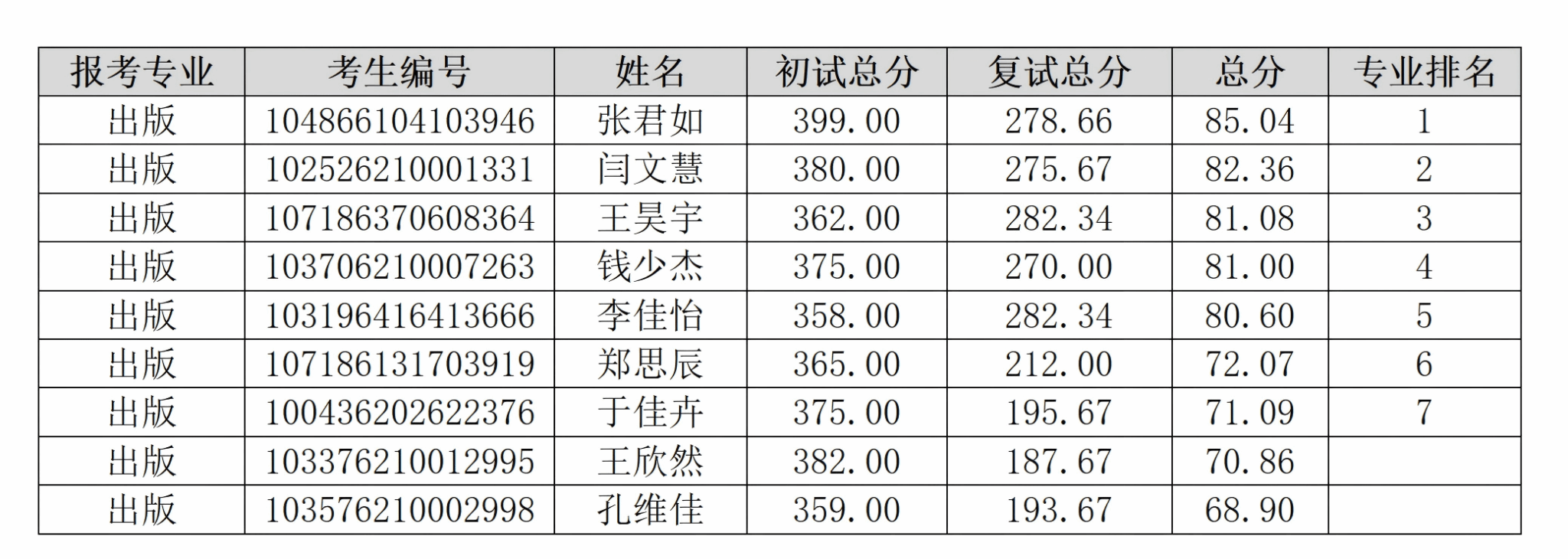 现将国际中文教育(045300)和出版(055300)硕士研究生复试调剂(一批次)考生成绩予以公示。
