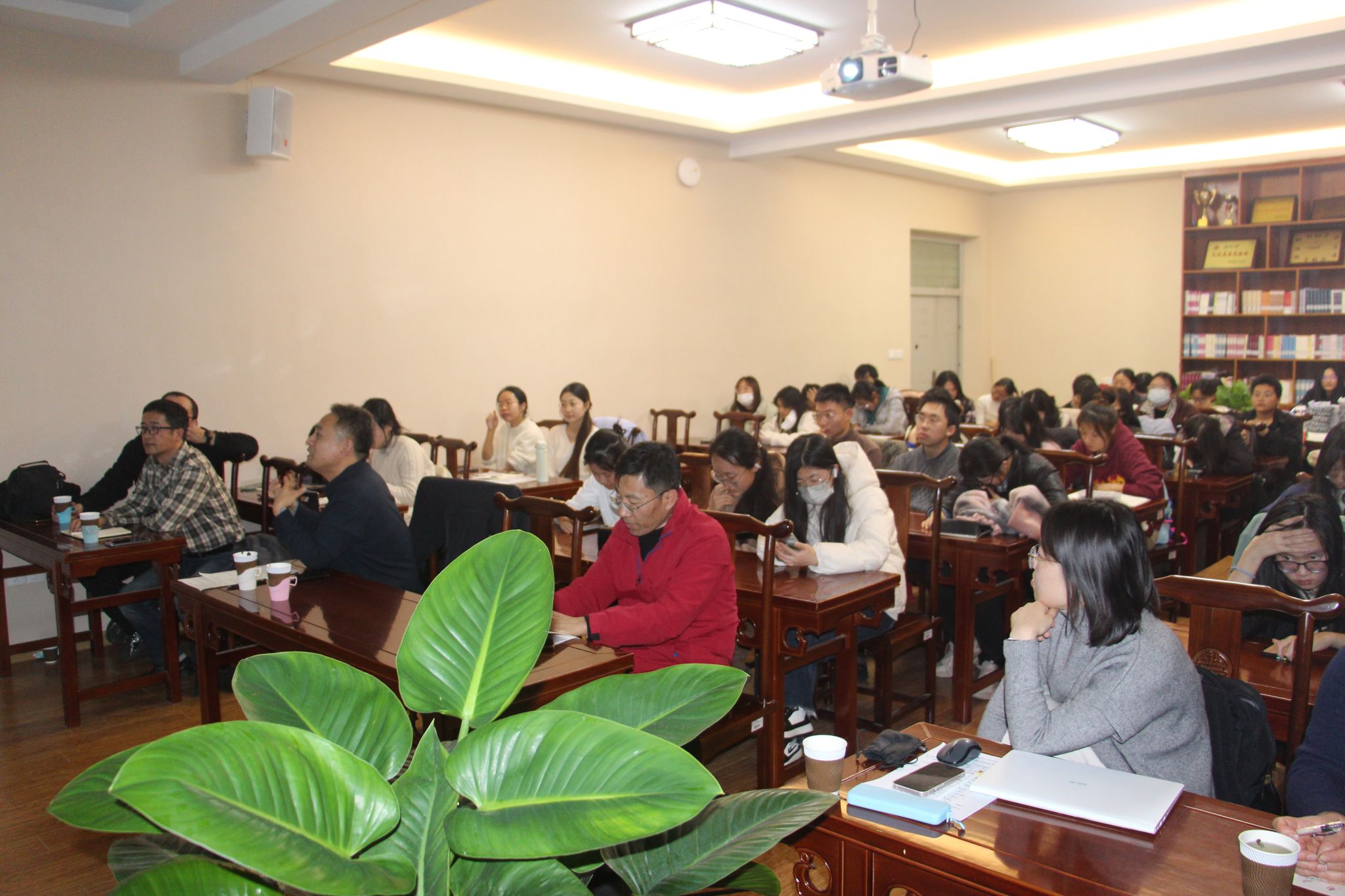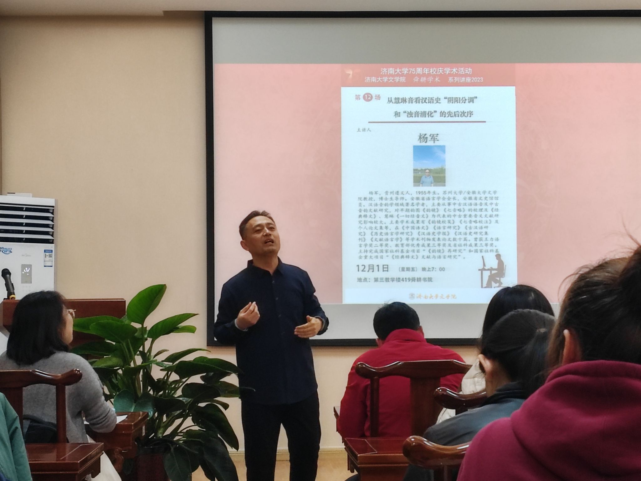杨军教授学识渊博、视野开阔,引经据典、鞭辟入里地为大家讲解了汉语史上曾经发生过的“阴阳分调”和“浊音清化”两项重要音变,激发了在座师生的浓厚兴趣。师生们都被杨军教授的讲座所吸引,现场气氛热烈。