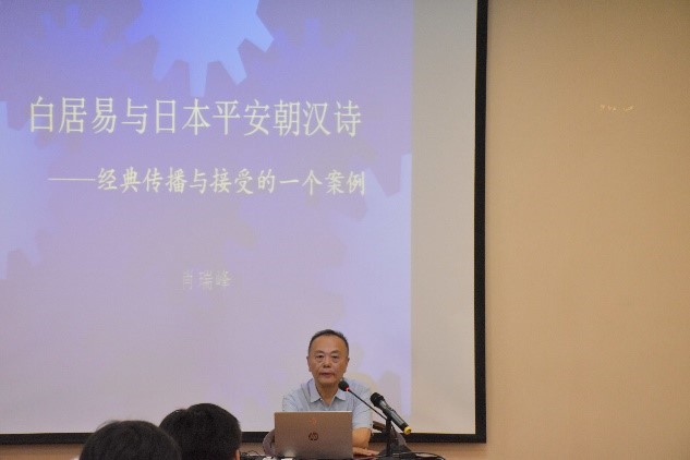 ,在舜耕书院为师生带来了题为“白居易与日本平安朝汉诗——经典传播与接受的一个案例”的学术报告。肖教授认为考察古代经典作家的影响,不应仅仅从时间(历史)的角度辨析前后代之间的传承关系,而且应从空间(地理)的角度探讨辨析左右邻之间的借鉴关系;文学的传播与接受往往不以作家个人的意志为转移,也不与主流意识形态及传统审美规范相对应,而表现出错综复杂、难以预料的情况。肖教授的讲座提出了很多创新性思路与方法,与会师生气氛热烈。